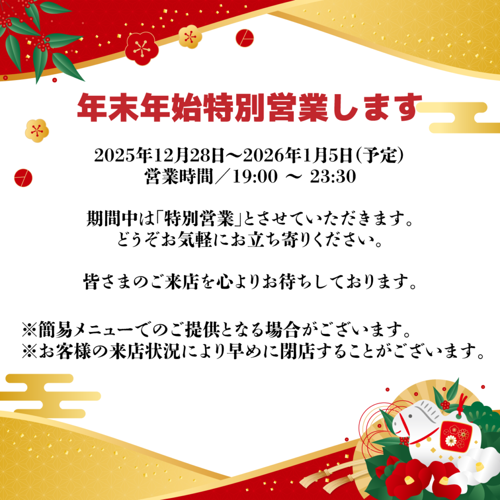 ・年末年始限定のチャージ料(無料)やメニュー価格の変更はございません。通常通りの料金体系で営業いたします。